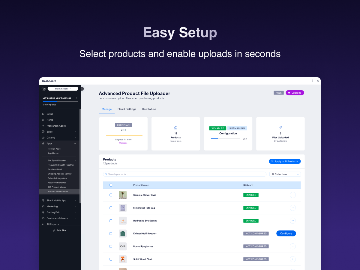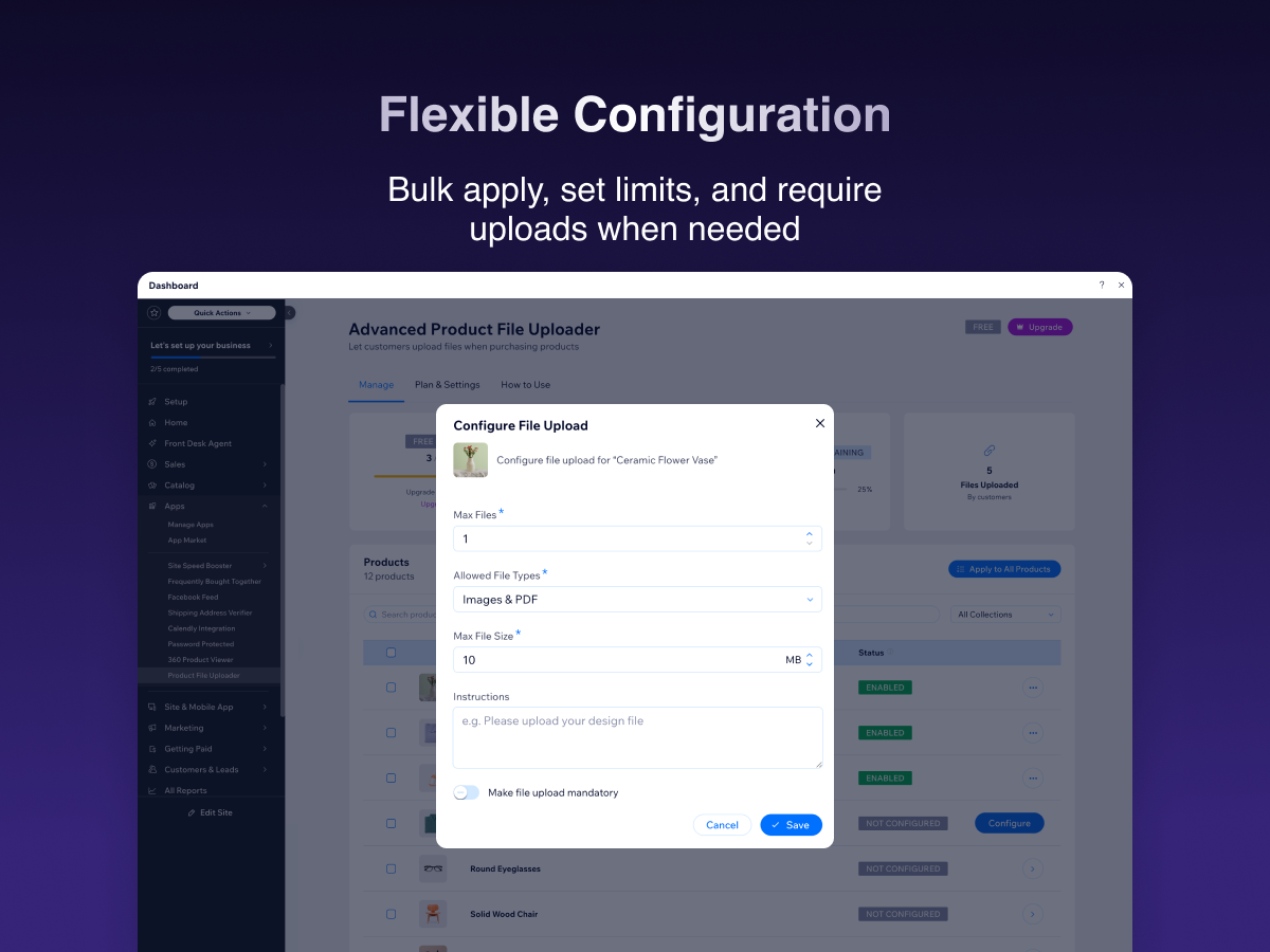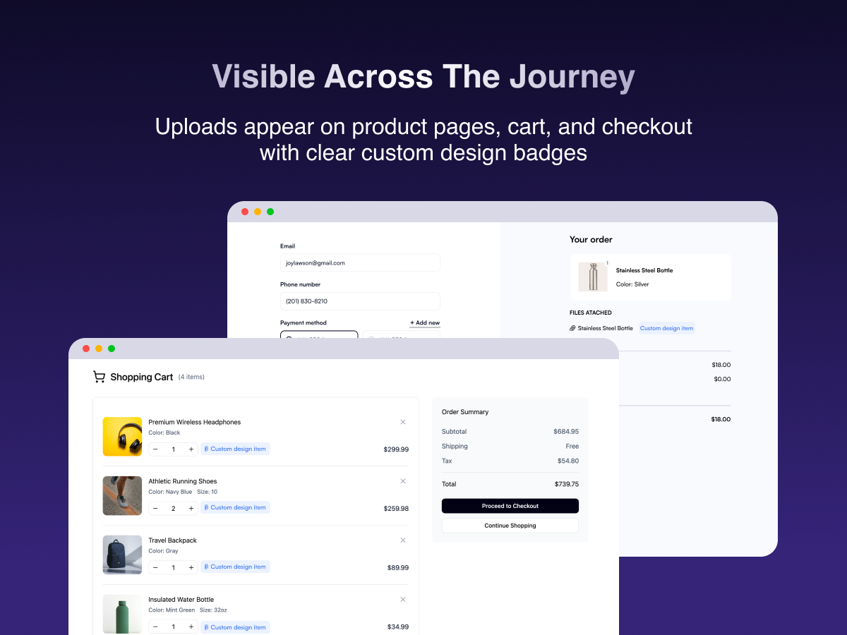 How it works: Choose which products accept file uploads from a simple dashboard. Set allowed file types (images, PDFs, documents), maximum file size, and how many files each customer can upload. Customers see a clean upload area on the product page, drag and drop their files, and proceed to checkout.