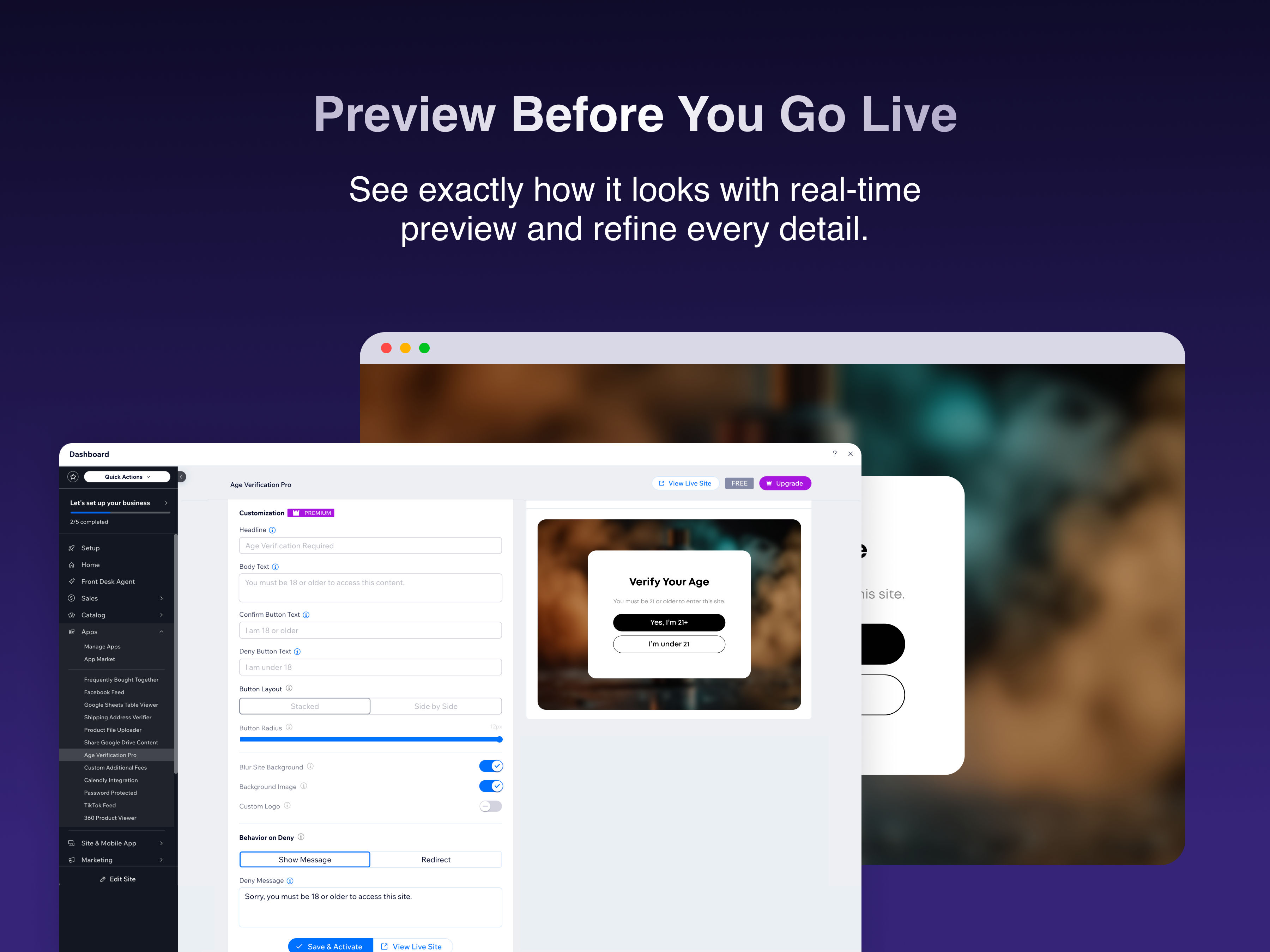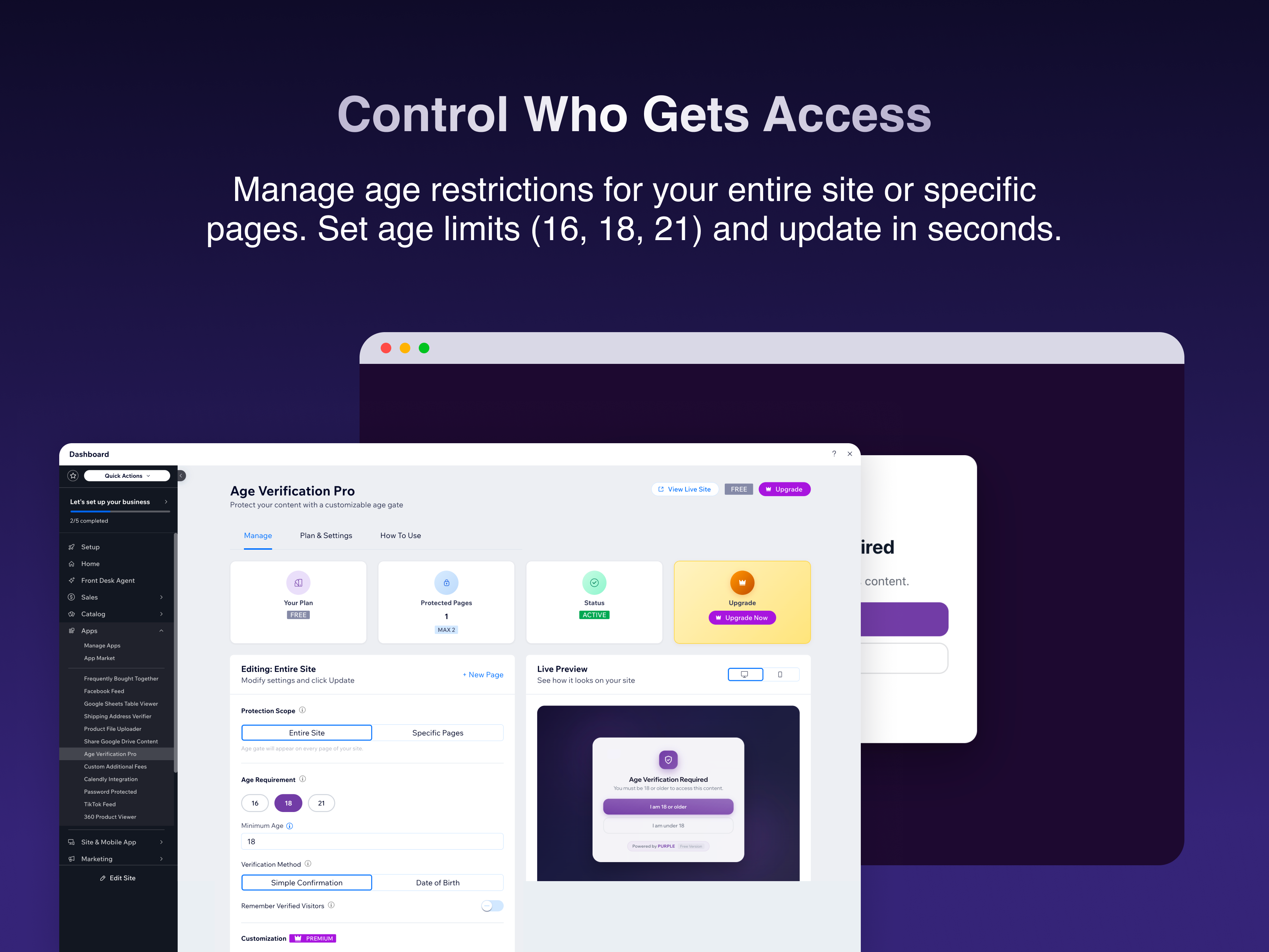 Age Verification Pro lets you add a professional age gate to any page on your site - right from your dashboard. No widgets to place, no code to write.