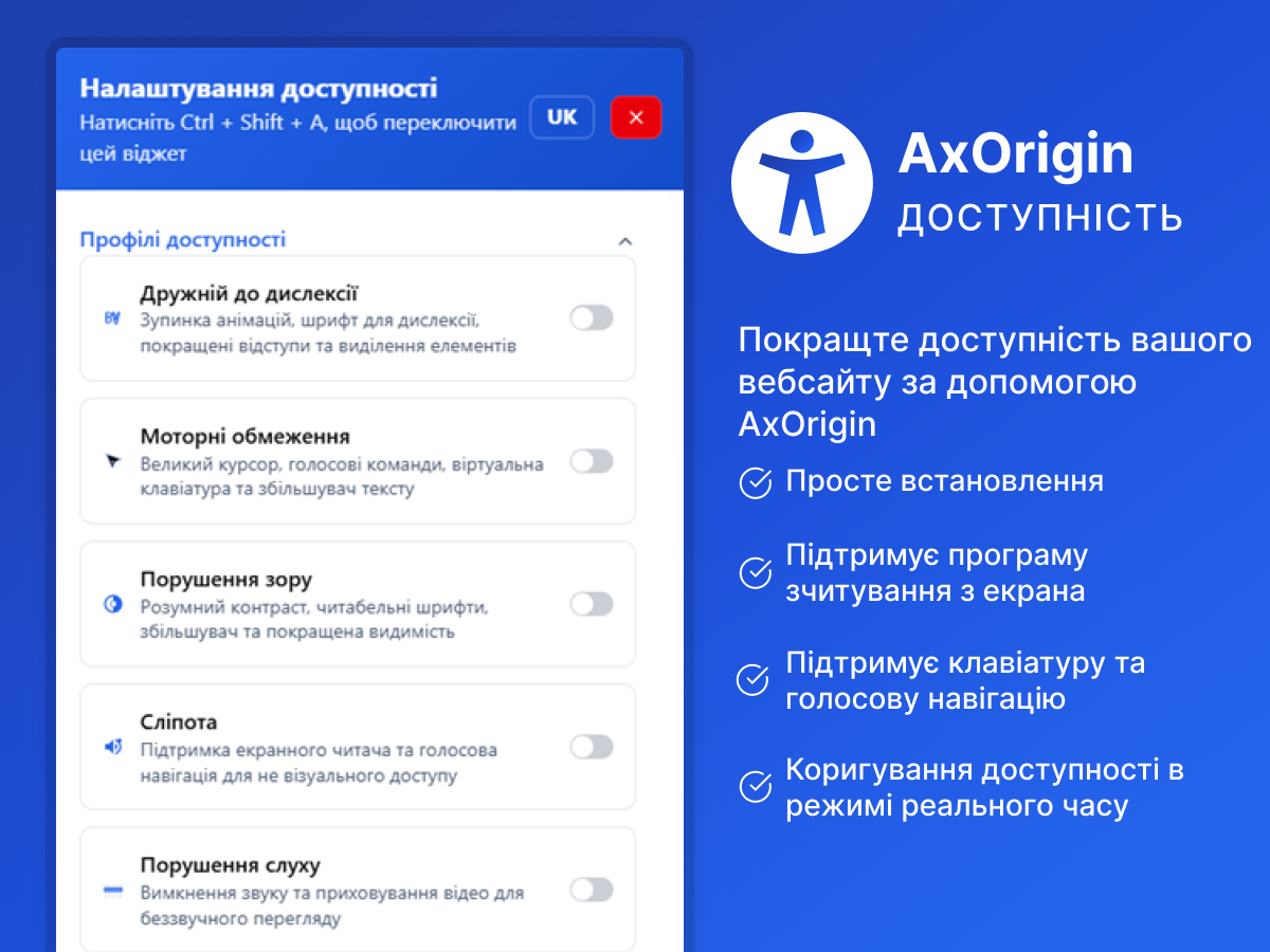 • Наш віджет на базі штучного інтелекту працює двома основними способами: по-перше, він безперебійно працює у фоновому режимі, автоматично покращуючи текст заміщення зображень, покращуючи навігацію за допомогою клавіатури та вирішуючи проблеми зі спеціальними можливостями на вашому веб-сайті. По-друге, інтерфейс спеціальних можливостей дозволяє користувачам налаштовувати інтерфейс користувача та дизайн вашого сайту відповідно до їхніх конкретних вимог до спеціальних можливостей. Додаток AxOrigin Accessibility значно покращує доступність веб-сайту для людей з вадами слуху або зору, руховими порушеннями, дальтонізмом, дислексією, когнітивними та навчальними проблемами, судомними розладами, епілепсією та СДУГ.