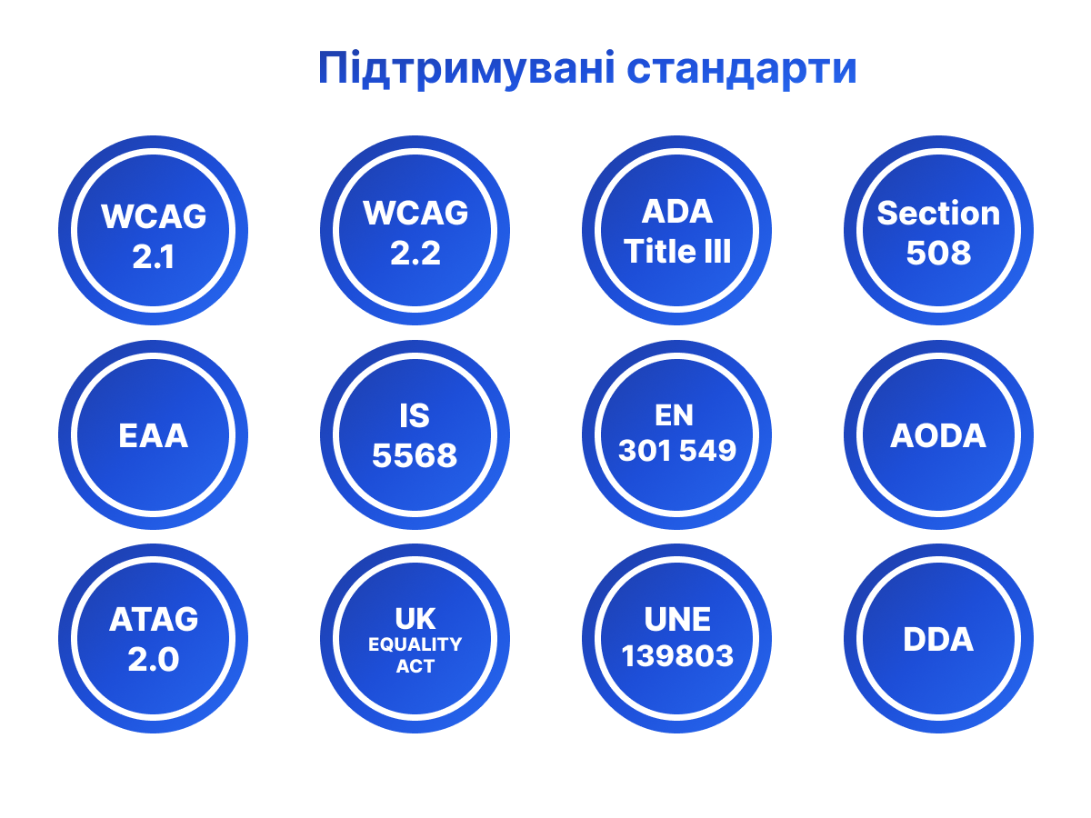 • Віджет доступності AxOrigin покращує відповідність веб-сайту вимогам ADA та покращує враження від перегляду відповідно до різних стандартів доступності, включаючи WCAG 2.0, 2.1 та 2.2; Розділ 508; Закон Унру Каліфорнії; RGAA Франції; європейський EAA EN 301 549; UNE 139803:2012 Іспанії; Закон про рівність (EA) Великої Британії; DDA Австралії; Стандарт 5568 Ізраїлю; AODA Онтаріо; ACA Канади; BITV Німеччини; Закон про інклюзію Бразилії (LBI 13.146/2015); JIS X 8341 Японії; Закон Stanca Італії; та стандарти DDA Швейцарії.