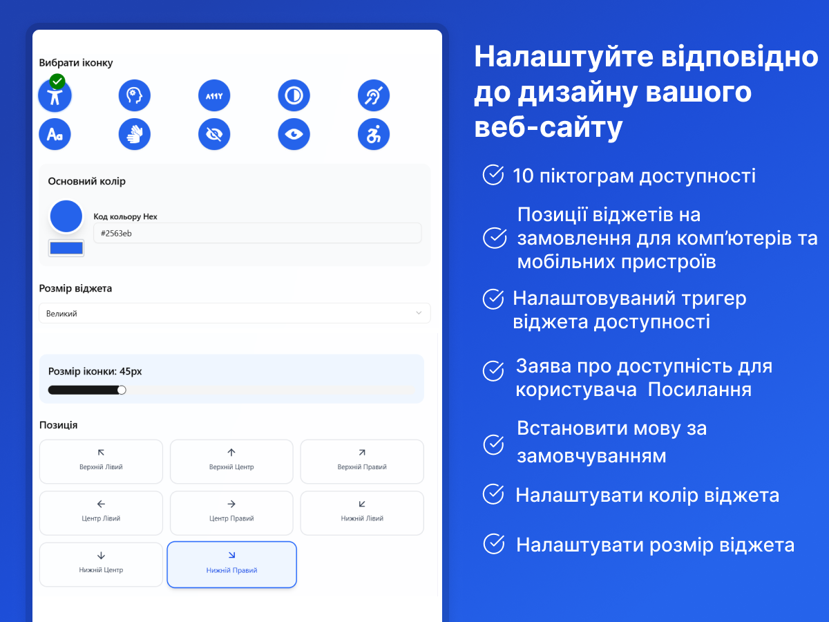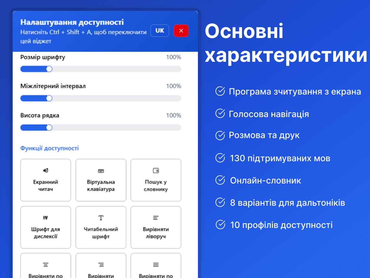 Список функцій, що пропонуються віджетом доступності AxOrigin: 1. Зчитувач з екрана 2. Голосова навігація 3. Розмова та введення тексту 4. Пошук у словнику 5. Посилання на спеціальну заяву про доступність 6. Віртуальна клавіатура 7. 10 профілів доступності 8. 130 мовна підтримка 9. 9 налаштувань тексту та типографіки 10. 11 налаштувань кольору та контрастності 11. 13 налаштувань медіа та візуальних елементів 12. 8 режимів для дальтоніків 13. Спеціальний віджет (позиції, колір, значок, розмір) 14. Параметри приховування/скидання віджета 15. Підтримка навігації за допомогою клавіатури та комбінацій клавіш Чому варто обрати віджет доступності AxOrigin як головне рішення для доступності? • Безкоштовний 14-денний пробний період • Цілодобова підтримка, яка допоможе вам у будь-який час • Швидке та просте встановлення, що виконується менш ніж за хвилину • Вигідні ціни • Легкий дизайн з адаптивними функціями • Ідеально підходить для бізнесу будь-якого розміру та типу Спробуйте провідний віджет доступності, розроблений для легкого та ефективного покращення доступності вашого веб-сайту.