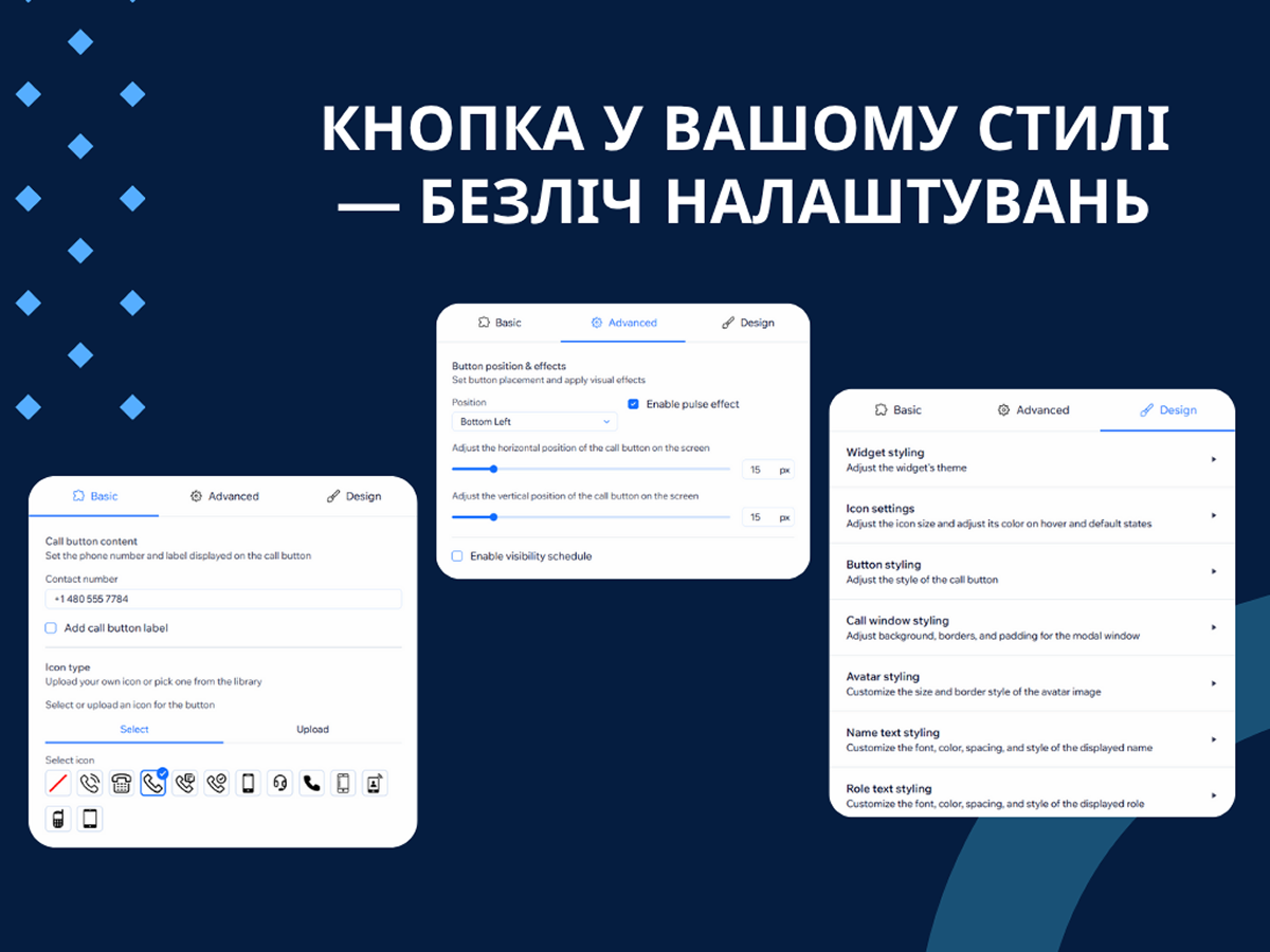 Кастомізуйте кнопку дзвінка — змінюйте іконку, колір, розмір і позицію під дизайн вашого сайту.