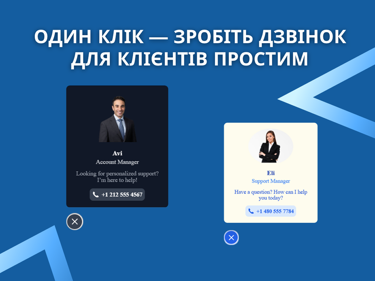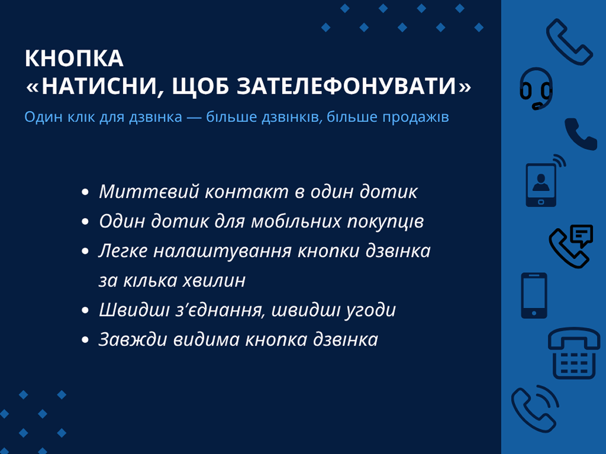 Кнопка “Click to Call” допомагає клієнтам миттєво зв’язатися з вами через зручну плаваючу кнопку дзвінка.
