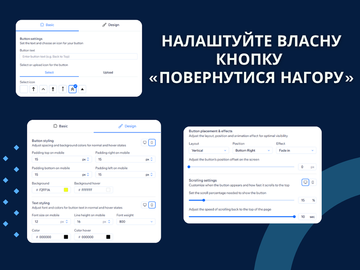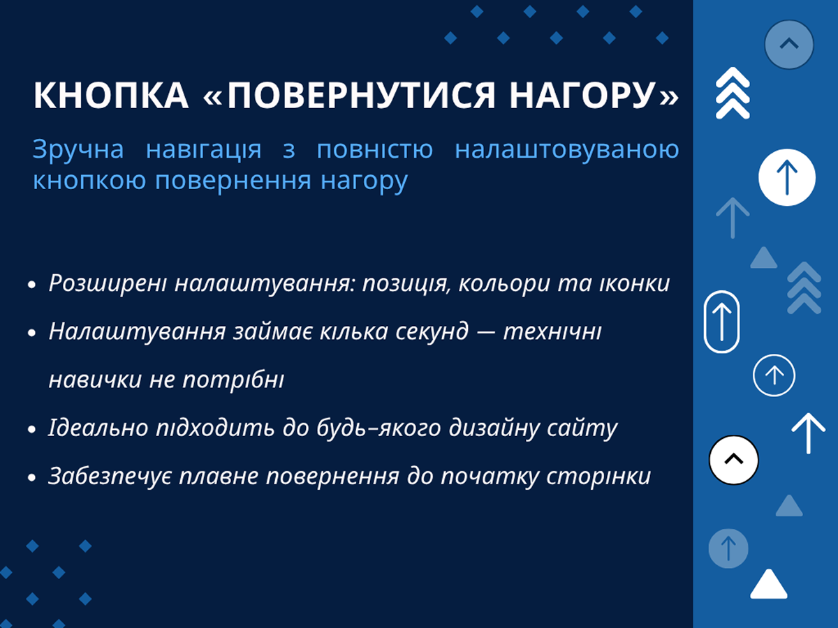 Покращуйте зручність користування вашим сайтом за допомогою налаштовуваної кнопки «Повернутися нагору» — ідеальне рішення для довгих сторінок і зручної мобільної навігації.