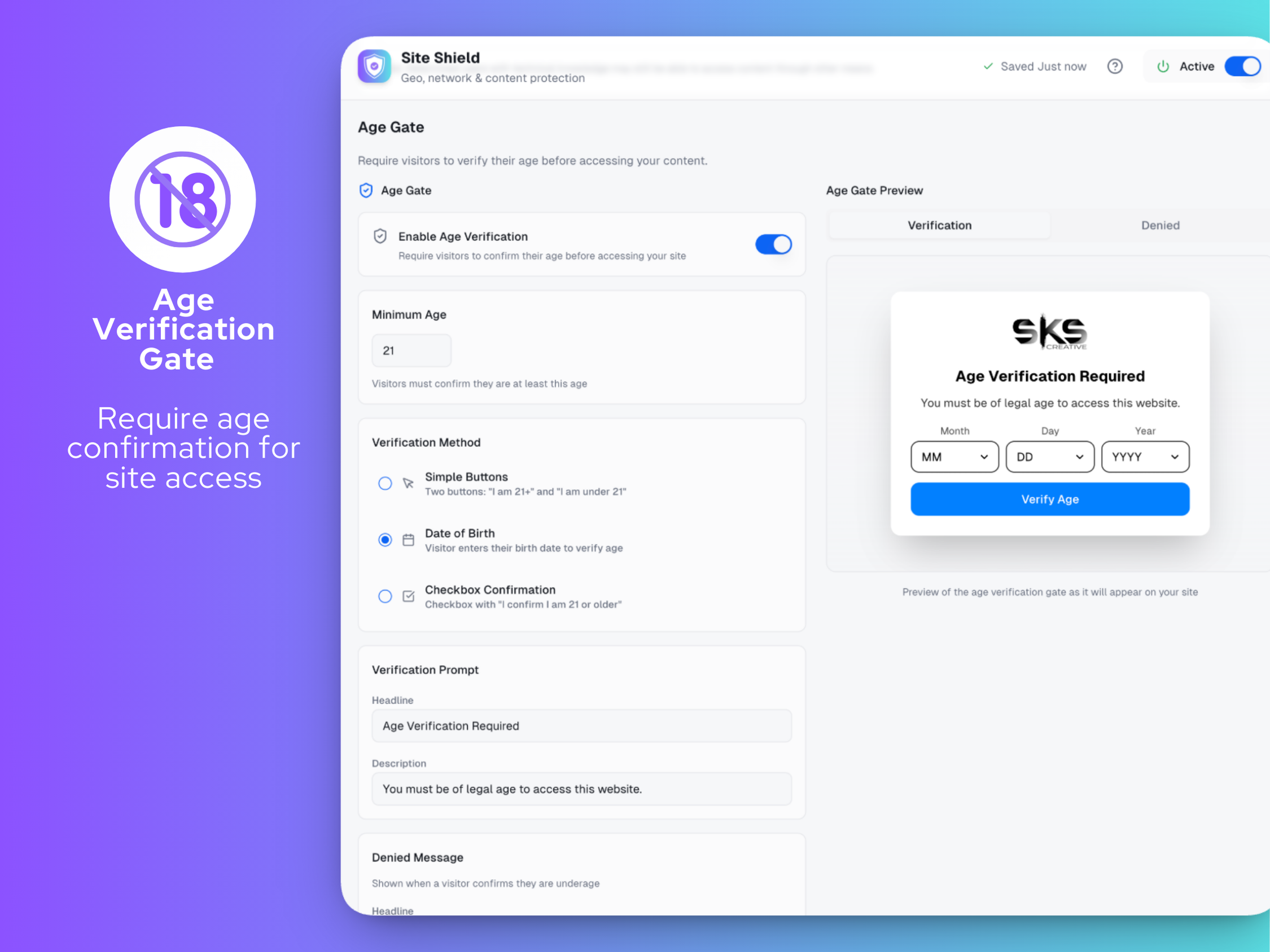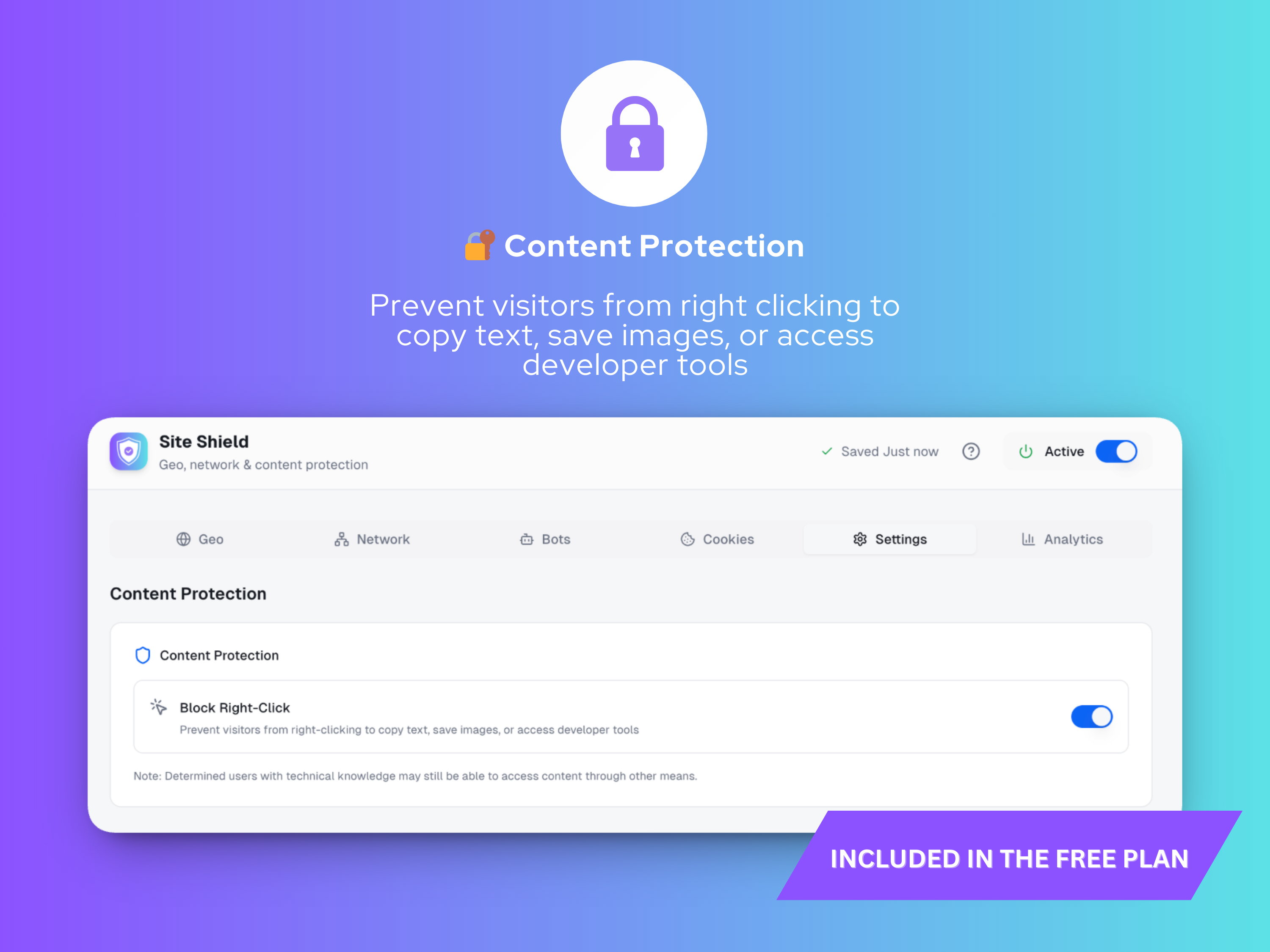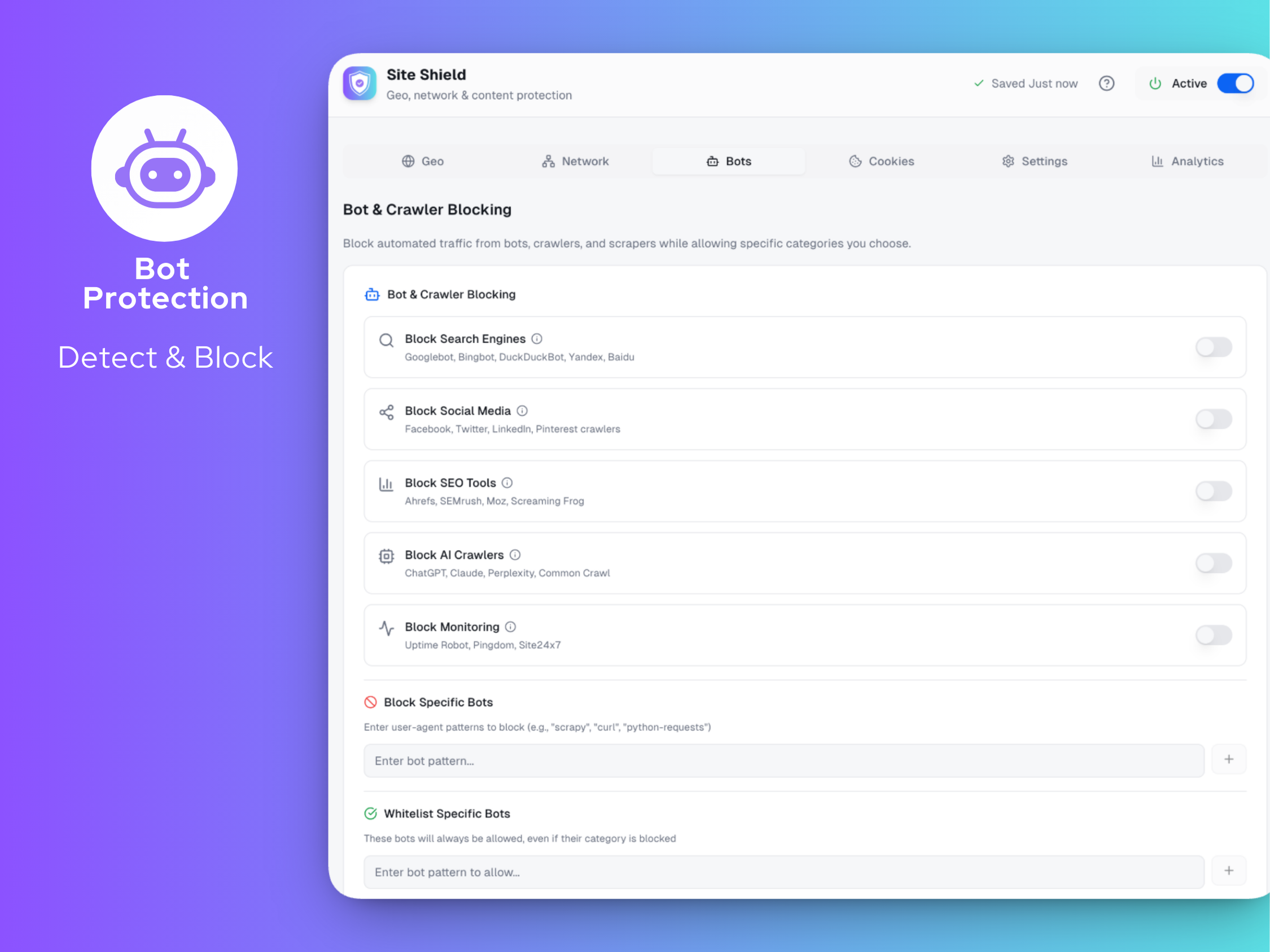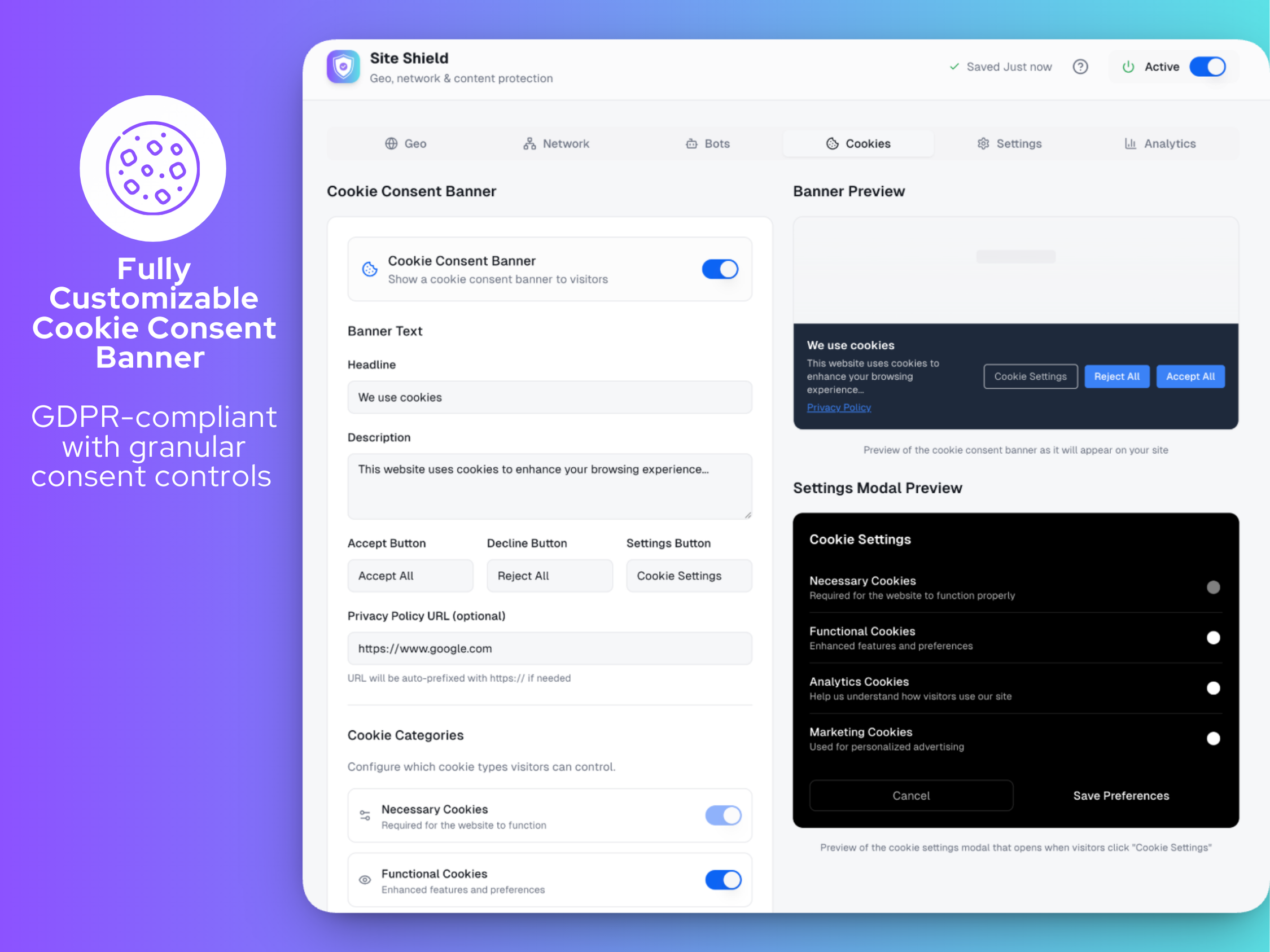 Site Shield gives you complete control over your website's audience. Block unwanted traffic from specific countries, stop VPN users from bypassing your restrictions, add a cookies consent banner, and protect your valuable content, all from one easy-to-use dashboard.