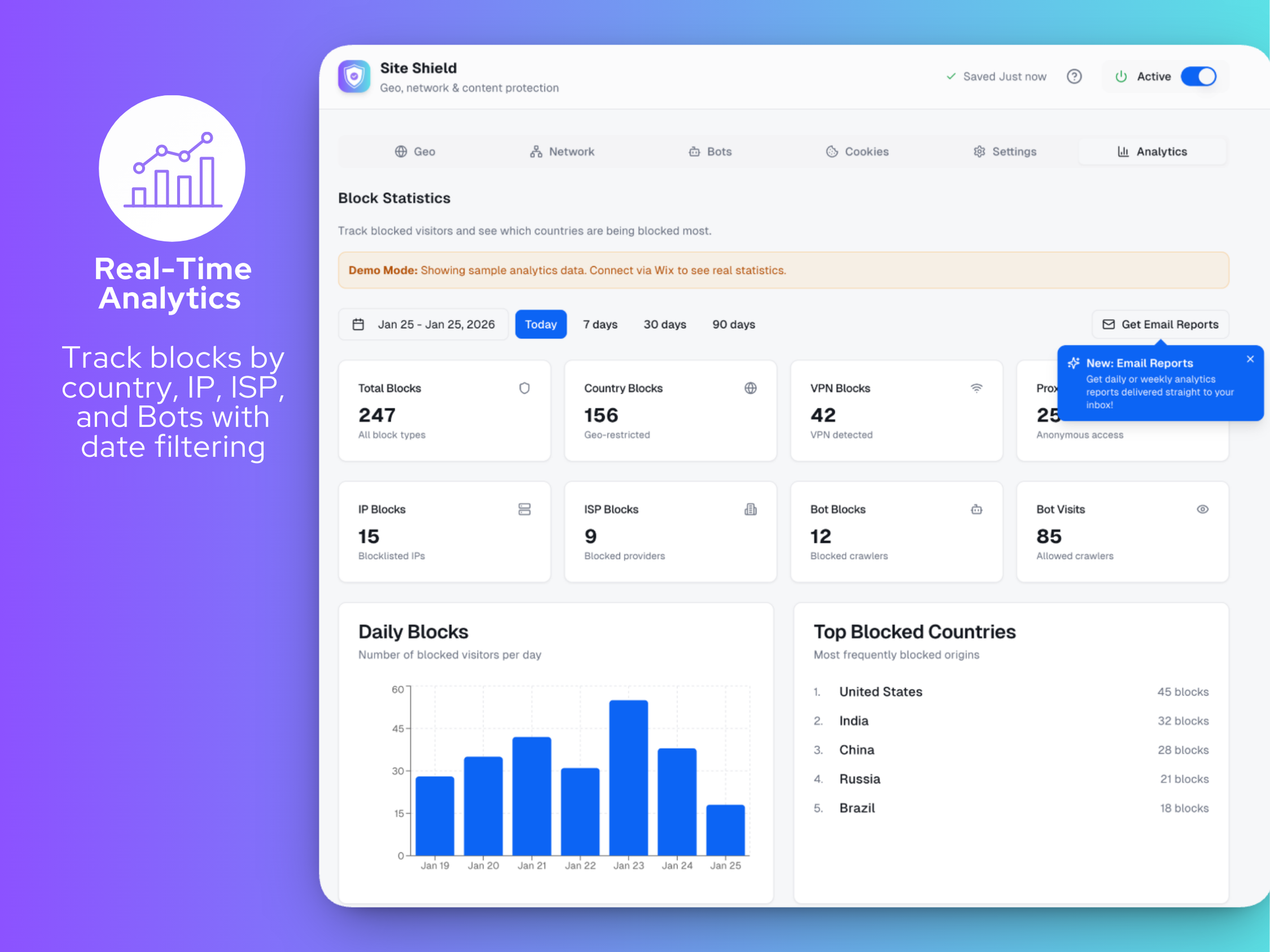 - Real-Time Analytics - Track blocks by country, IP, ISP, with date filtering