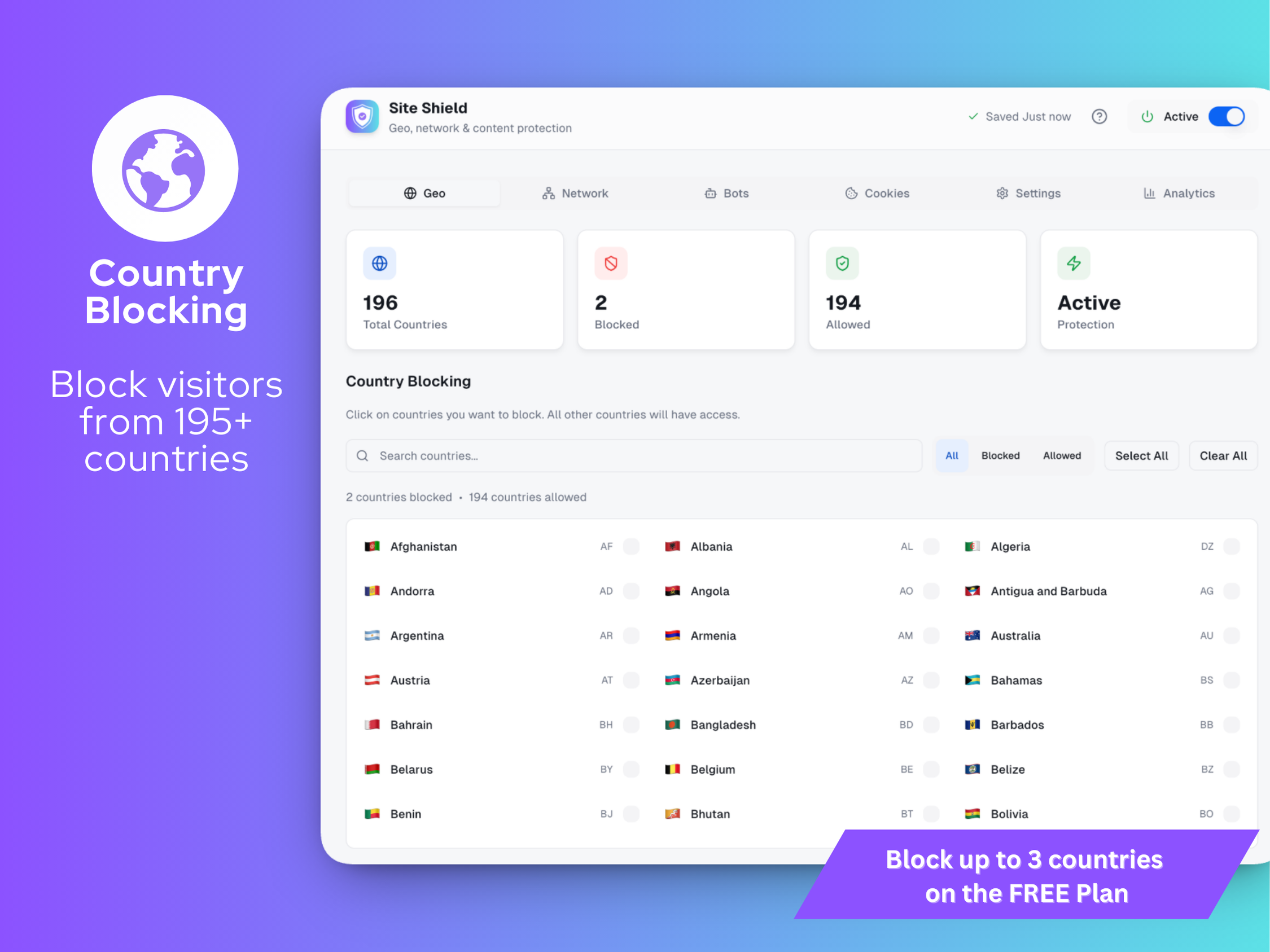 Country Blocking Block visitors from any country with one click. Select from 195+ countries and territories