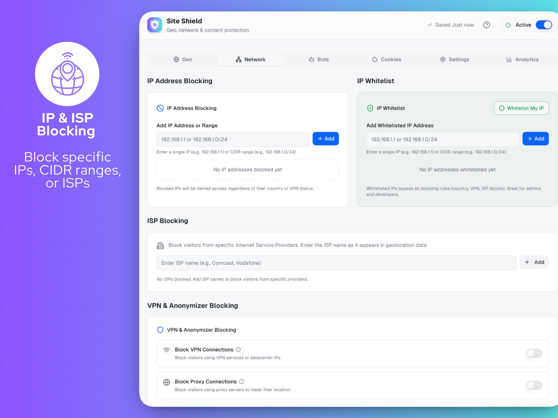 Block specific IP addresses or entire ISPs. Supports individual IPs and CIDR ranges