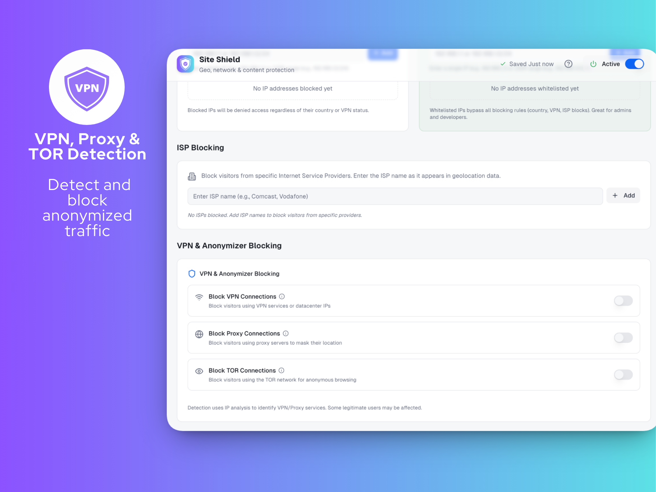 - IP & ISP Blocking - Block specific IPs, CIDR ranges, or ISPs