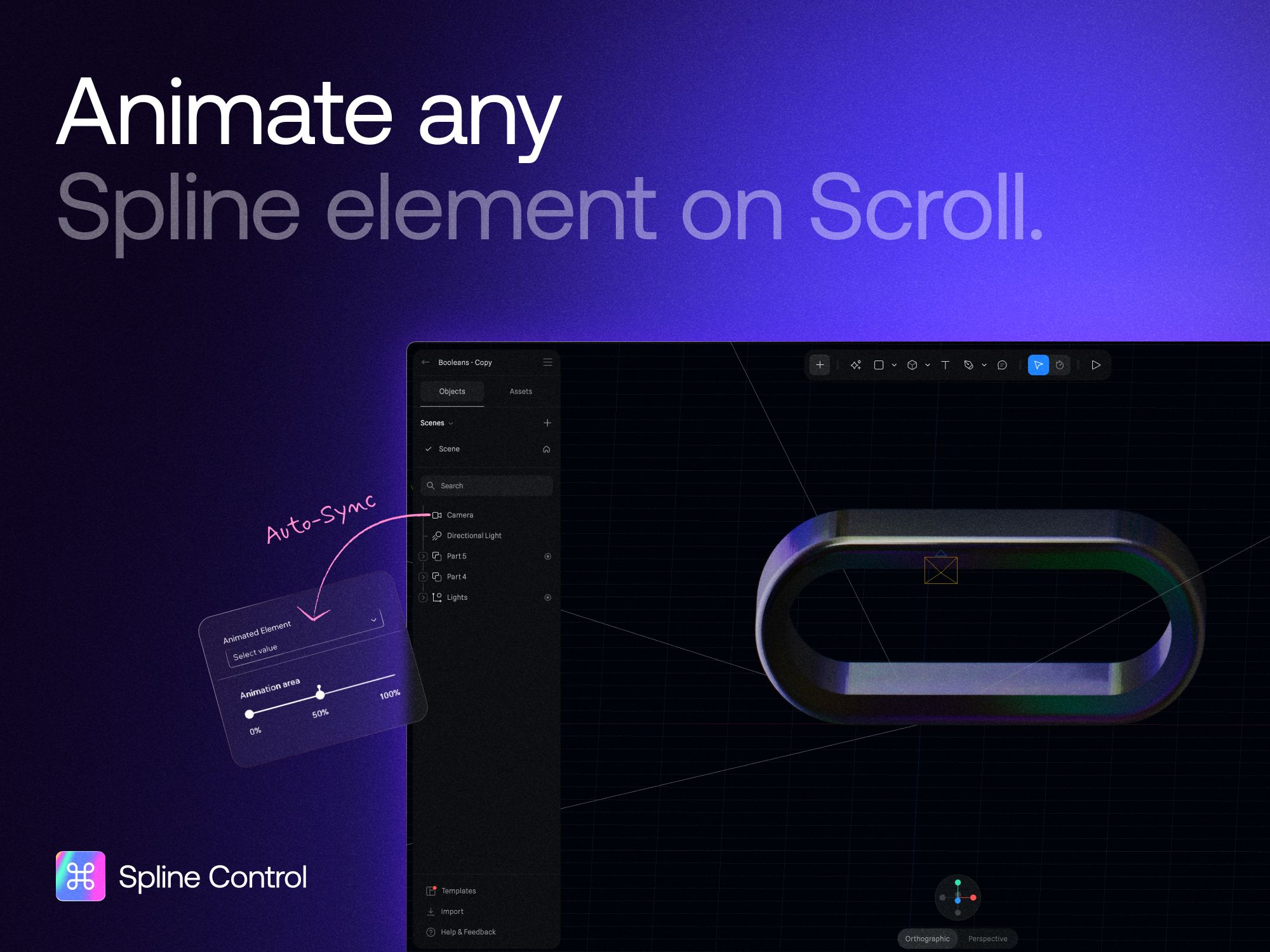 Create breathtaking scroll-based 3D experiences by simply connecting your Spline scenes and controlling every movement visually. No code, no setup hurdles. Just drag, drop, and animate your ideas exactly the way you imagine them.
